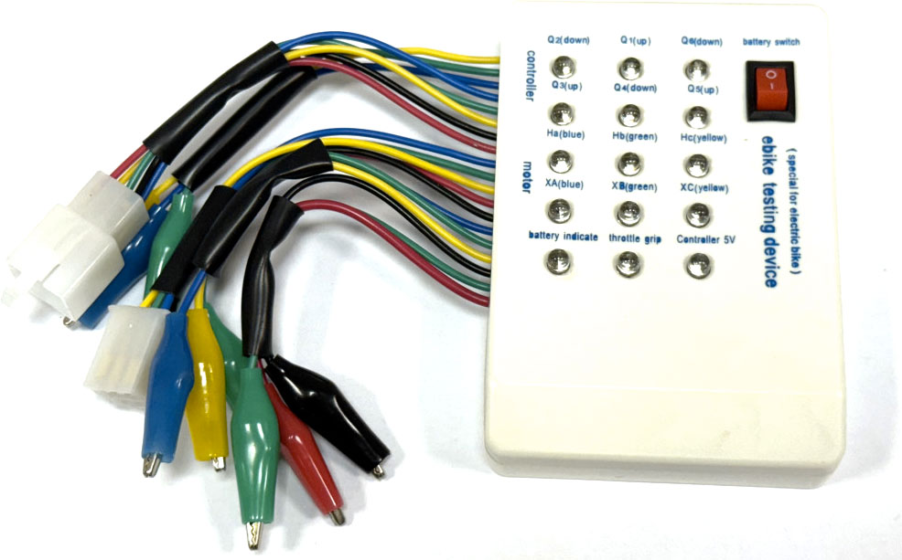 Выключатель питания на приборе должен находиться в положении «выкл.» (off). Подсоединить силовые провода от мотор-колеса к проводам на приборе (4-6 провода слева) при помощи зажимов «крокодильчиков». Цвета всех трех пар соединяемых проводов должны совпадать. Подсоединить пятиштырьковый штекер от датчиков мотор-колеса к соответствующему разъёму на приборе. Перевести выключатель на приборе в положение «ВКЛ», при этом, светодиод «POWER» засветится красным светом. Начните вращать колесо руками. При вращении светодиоды АВС и аbс, должны по очереди загораться. Это свидетельствует об исправности мотор-колеса. Отсутствие свечения одного или нескольких светодиодов АВС – свидетельствует о неисправности (обрыве контакта в катушках) мотор-колеса. Отсутствие свечения одного или нескольких светодиодов аbс – свидетельствует о неисправности датчиков мотор-колеса, или обрыве подходящих к ним проводов.