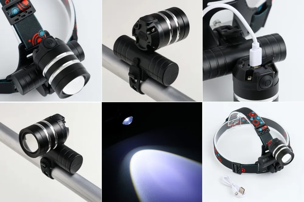 Фонарь налобный RAPIDO, 2 COB LED, USB кабель, аккумулятор 1200 mAh,  настраиваемый ZOOM, с креплением на руль.