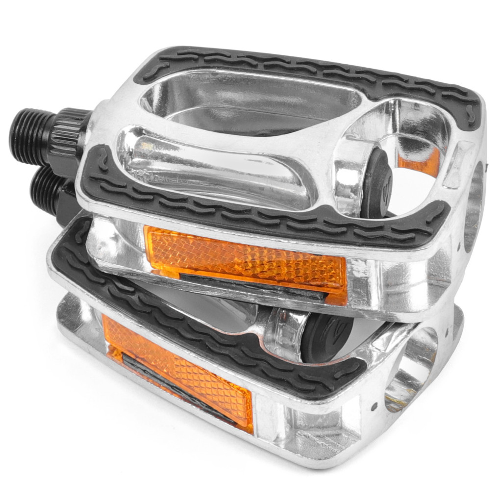 Недорогие педали для городских велосипедов от фирмы Vinca Sport. Корпус и рамка изготовлены из прочного и легкого алюминия. Рельефные резиновые накладки обеспечивают хорошее сцепление с педалью при езде в обычной городской обуви. Катафоты на боковых поверхностях улучшают заметность ездока при движении по проезжей части.