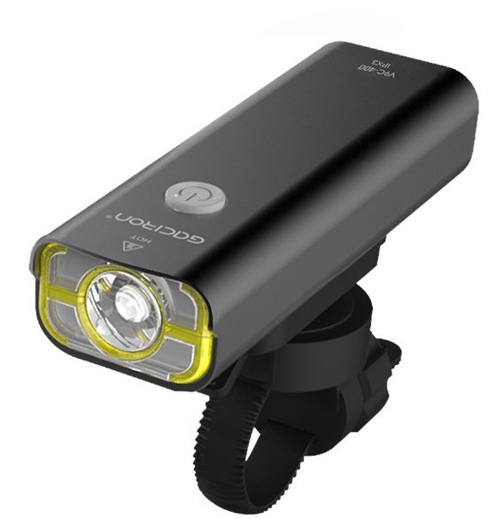 Яркая передняя фара GACIRON V9C-400 со световым потоком 400 люмен от 1 светодиода. 4режима работы, Li-аккумулятор, USB-зарядное, крепление на руль, алюминиевый корпус, черная, вес 120 грамм.