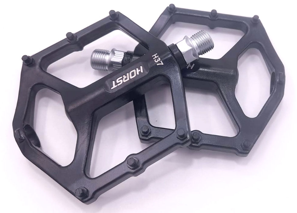 Широкие литые с шипами педали Horst H37 для горных и прочих велосипедов. Умеренный вес, широкая платформа для удобного катания в любой обуви.