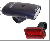 Фара галогеновая, пластиковый корпус, с поворотным креплением на руль, черная; фонарь светодиодный, 3 диода, 3 функции, красный, с батареями, инд. уп.