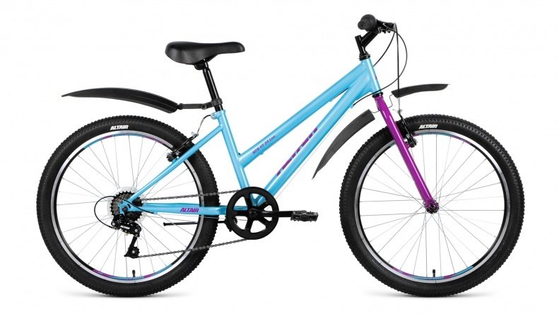 Подростковый велосипед для девочек MTB HT 24 Low с удобной рамой заниженного типа, защитным кожухам на звездочке, убирающейся подножкой и пластиковыми крыльями в комплекте. Колеса диаметром 24 дюйма с износостойкими шинами Wanda 1288 позволяют с комфортом кататься по всем типам дорог, включая даже гравийные. Полный набор механики Altair, V-образные тормоза, надежная жесткая вилка из стали, эргономичное седло и 6 скоростных режимов для оптимизации нагрузок.