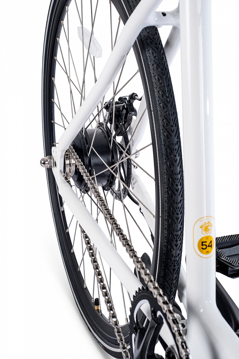 Bear Bike EKB - удобный электровелосипед продуманной конструкции. Колёса с покрышками 700x35c обладают хорошим накатом. Основой модели является рама из алюминиевого сплава, которая обладает достойными весовыми и прочностными характеристиками. Жёсткая вилка мало весит и удобна. Дисковые механические тормоза Tektro M280 сокращают время торможения и обеспечивают комфортное управление байком. Одна передача 44/16.