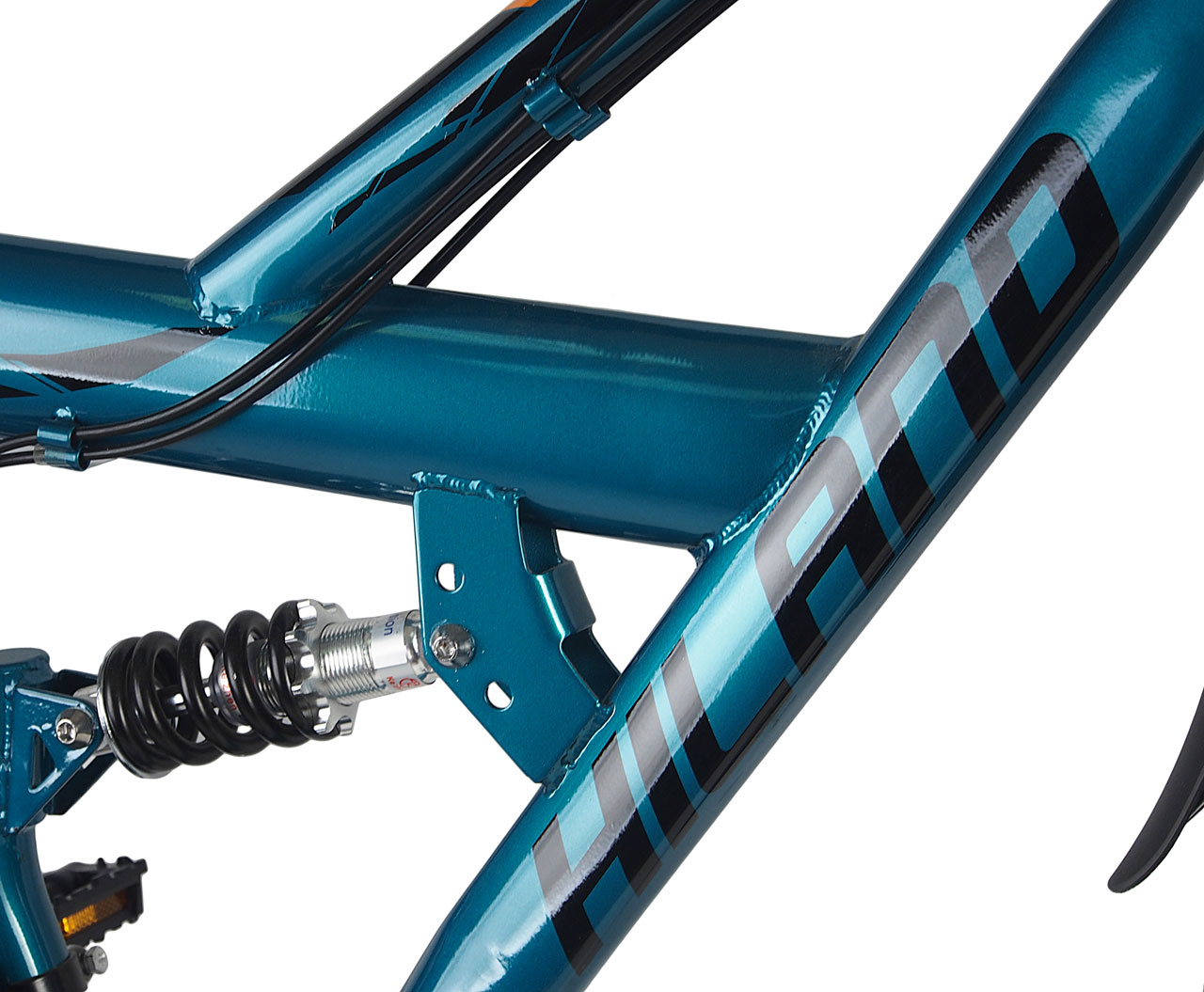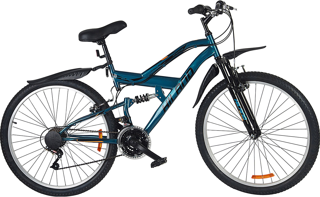 Бюджетный двухподвесочный горный велосипед на 26-дюймовых колесах HILAND для поездок по самым разнообразным дорогам. Стальная рама, амортизационная вилка, 21-скоростная трансмиссия, ободные тормоза, двойные алюминиевые обода.