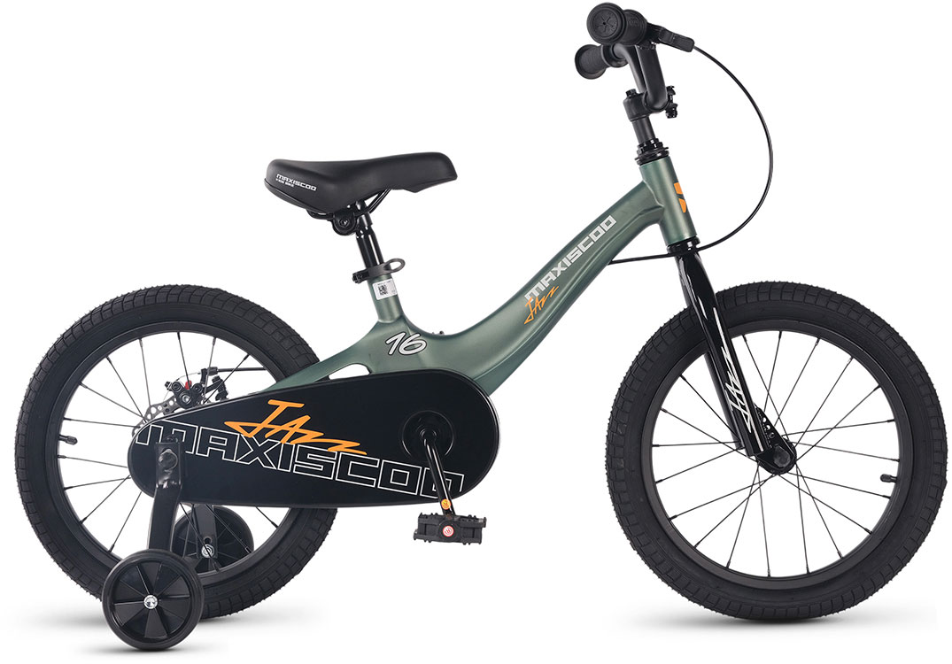 Maxiscoo Jazz 16 Базовый предназначен для детей от 5 до 6 лет. Страховочные колеса на этом детском велосипеде помогут начинающему райдеру удерживать баланс и избежать падений. Байк оснащен задним дисковым тормозом, что обеспечивает надежное и эффективное торможение. Тормоза легко управляются даже маленькими руками ребенка, это повышает безопасность во время поездок. На велике установлен щиток на цепь, который защищает одежду малыша от попадания грязи и смазки, а также предотвращает возможные травмы от контакта с цепью.