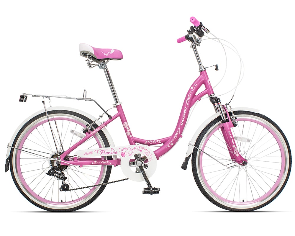 Подростковый велосипед Florina 24S 2022 от MaxxPro – яркий ситибайк с полным набором аксессуаров, который скорее понравится девочкам. Велосипед собран на легкой алюминиевой раме. Заниженная верхняя труба позволяет быстро садиться на байк, ездить даже в юбке или платье. Амортизационная вилка сглаживает неровности, позволяет чувствовать себя уверенно и комфортно на каменистой, ухабистой дороге, городской брусчатке. Трансмиссия Shimano на 6 передач делает преодолимыми любые подъемы, благодаря разным режимам езды юный райдер будет меньше уставать. Простые в настройке ободные тормоза обеспечивают хороший уровень безопасности, вовремя останавливают велосипед на любой скорости. Подножка позволяет парковаться где угодно. на багажнике можно возить малогабаритные грузы. Полноразмерные крылья и щиток на цепь уберегут от брызг из-под колес.
