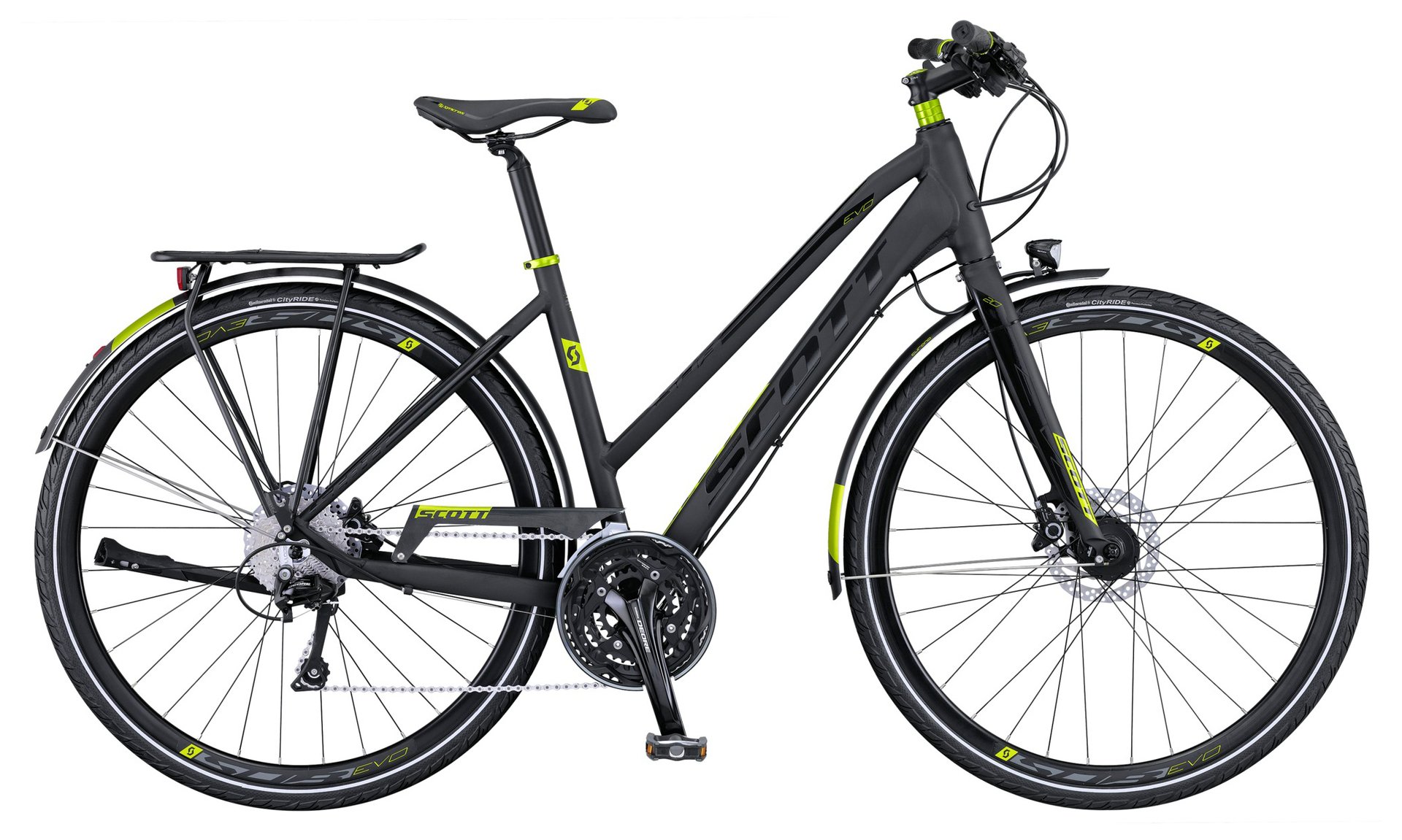 Женский городской велосипед на алюминиевой раме спортивной геометрии от швейцарской фирмы Scott. Подойдет для ежедневных поездок по городу и перевозки небольших грузов. Оборудован МТБ трансмиссией начального профессионального уровня с 30 передачами и защитой цепи, динамо втулкой, которая питает интегрированные фары, всепогодными дисковыми тормозами, багажником и подножкой.