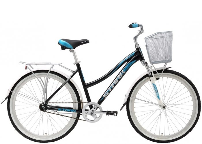 Женский прогулочный хардтейл с трансмиссией на одну скорость и ободными тормозами. Поставлены багажник, корзинка, переднее и заднее крыло.