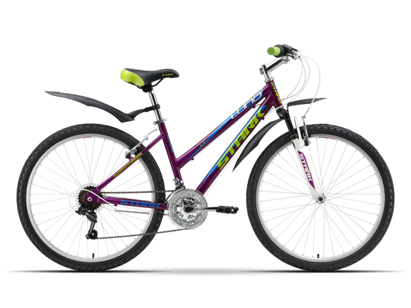 Женский горный велосипед с жесткой вилкой, рамой из алюминия и навесным оборудованием начального уровня. Установлены ободные тормоза, подножка и крылья.