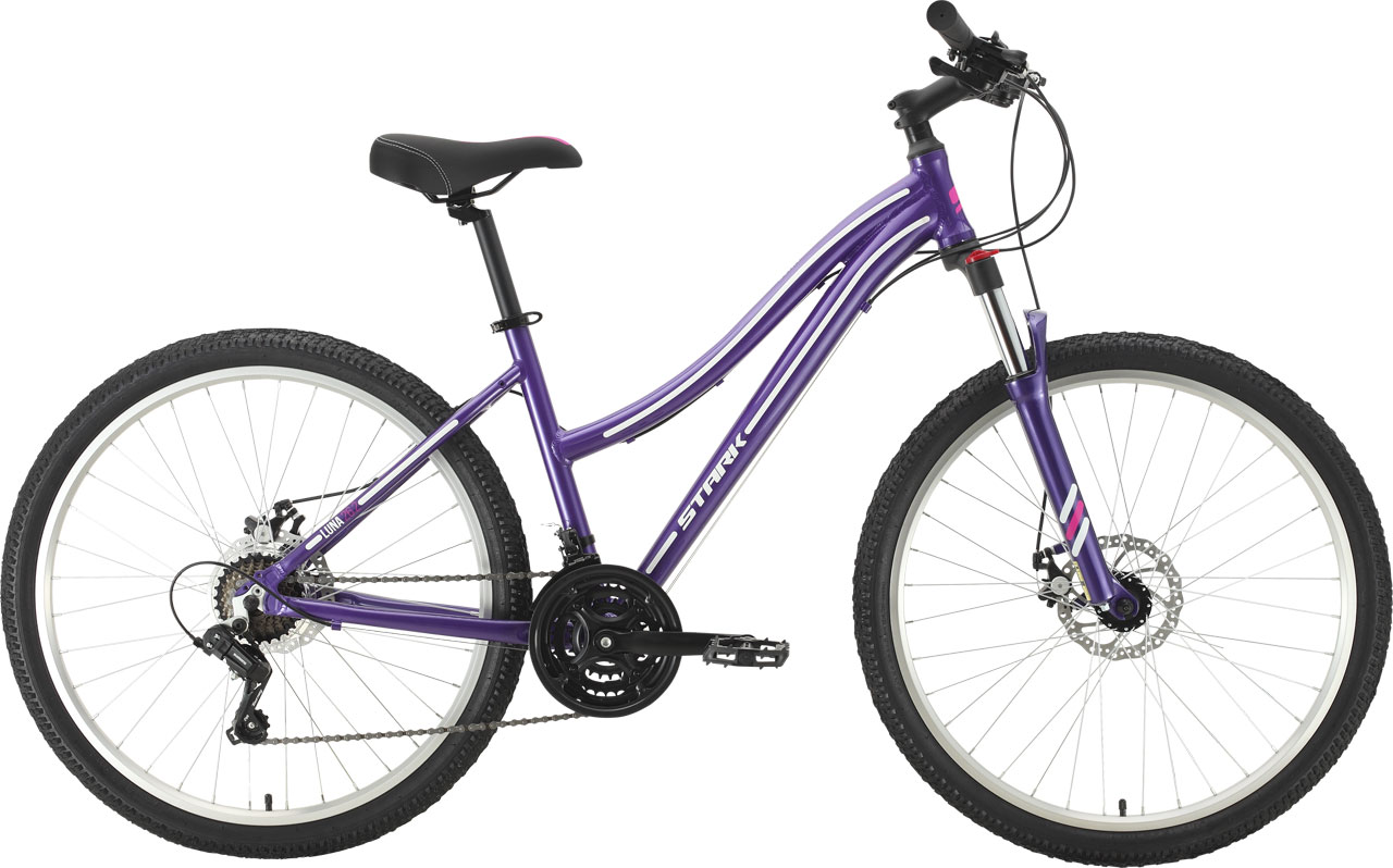 Женский горный велосипед Luna 26.2 D 2021 от Stark - хороший выбор для катания в городе, для фитнеса, а также велопрогулок по технически несложным лесным тропам. На модели Старк Луна 2021 года установлена пружинно-эластомерная вилка с ходом 100 мм и возможностью блокировки, а также настройки под вес райдера. Дизайн 2021 года стал более элегантным - глубокий фиолетовый в стильном тандеме с серебром. Все основные компоненты алюминиевые, поэтому Luna 26.2 D имеет сравнительно небольшой вес.