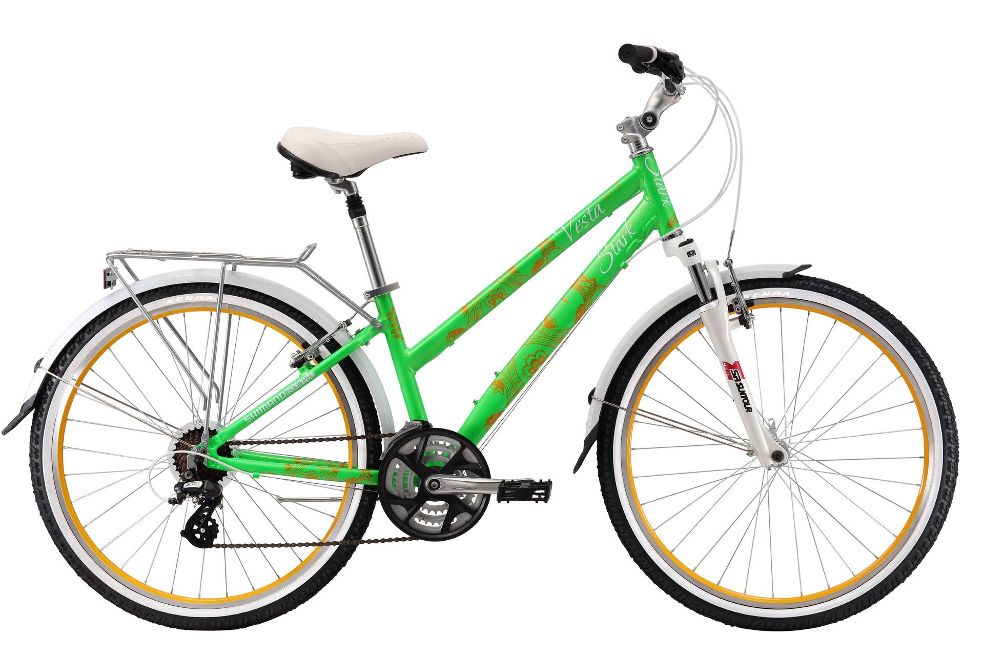 Женский велосипед, укомплектованный комфортной рамой из лёгкого алюминия и короткоходной мягкой вилкой. Снабжён подседельным штырём с амортизатором и прочным стальным багажником, можно изменить высоту руля, подойдёт для коротких велосипедных походов и прогулок по городу. Нетребовательные ободные тормоза, трансмиссия с 21 передачами позволяет подобрать оптимальное усилие на педали на любой скорости.