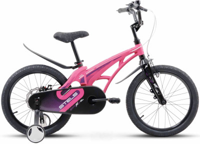 Stels Galaxy 18 – детский велосипед для 6-8 лет на раме из магниевого сплава с ободами из магния. С этим байком маленький райдер сможет часами напролет кататься, не уставая. Магниевая рама отлично гасит вибрации, при этом она прочная, а по легкости даже превосходит алюминиевые. За безопасную своевременную остановку начинающего велосипедиста отвечают сразу два тормоза – передний ободной и задний дисковый механический. Полноразмерная защита цепи убережет от быстрого загрязнения механизма, крылья защитят от грязи одежду. Стелс Галакси 18 – синглспид, с которым ребенку будет комфортно и весело, а родителям – спокойно.