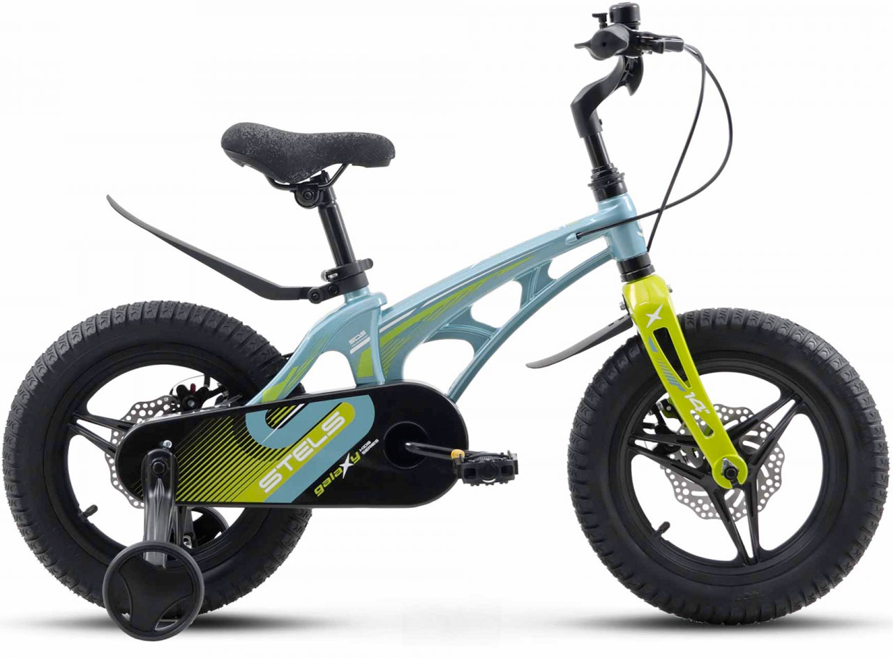 Stels Galaxy Pro 14 – легкий и прочный детский велосипед для 4-5-летних детей. Он собран на магниевой раме, оснащен жесткой магниевой вилкой и ободами из магния. Это обеспечивает меньший вес и высокую прочность, а также более высокую степень комфорта для маленького райдера, потому что этот материал отлично гасит вибрации. За безопасность начинающего райдера отвечает пара дисковых тормозов. Такой комплект гарантирует остановку на любой поверхности. Стелс Галакси Про 14 станет надежным спутником ребенка на прогулках в парке, покатушках во дворе или в поездках на дачу.