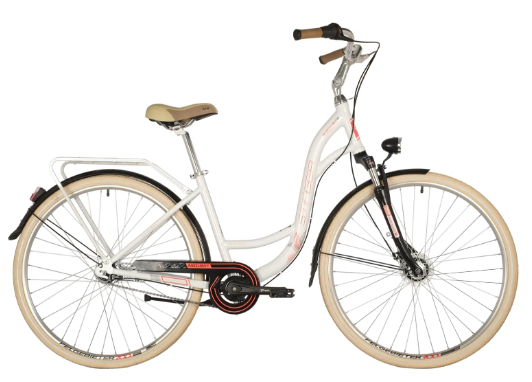 Самый модный прогулочный велосипед для женщин STINGER BARSELONA EVO легко подойдет для повседневного катания по паркам и набережным, фитнес-выездов на природу или поездок по делам и на работу. Рама создана по принципу комфортной посадки, лишена верхней трубы, при этом имеет два усиления несущей трубы. Трансмиссия с использованием планетарной втулки на 7 передач. Передний роллерный тормоз неприхотлив и плавный в работе, задний тормоз классический ножной. Велосипед оснащен передней и задней фарой, которые установлены на полноразмерных крыльях, а также багажник грузоподъемностью до 25 кг.