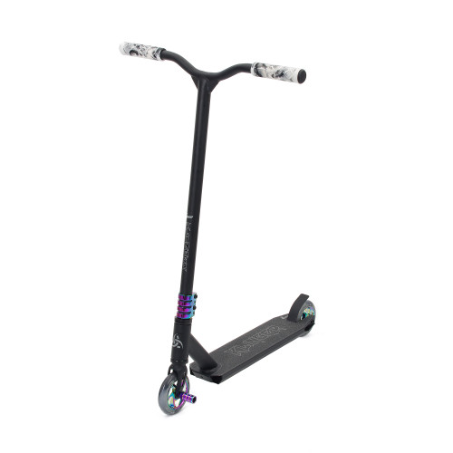 Первое, что "цепляет" в этом самокате - продуманная до мелочей дека. Идеально сбалансированные габариты позволяют чувствовать себя уверенно как в скейтпарке так и в стрите, торец деки заварен для большей жесткости и стабильности. Передняя пега и дополнительная ось идут в комплекте с самокатом.