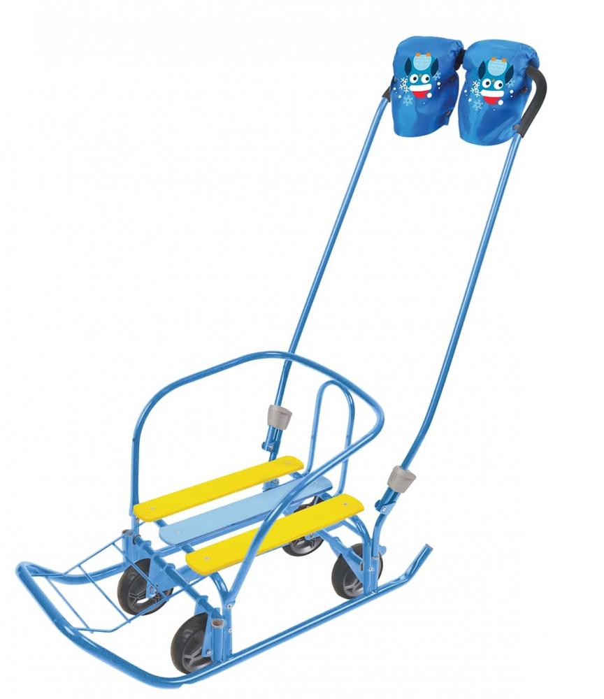 Санки с выдвижными колесами и ручкой-толкателем для катания и перевозки детей. Материал: каркас – металл; сидение – деревянные рейки. Отличительной особенностью данной модели стали рукавички для мамы или папы на ручке-толкателе.